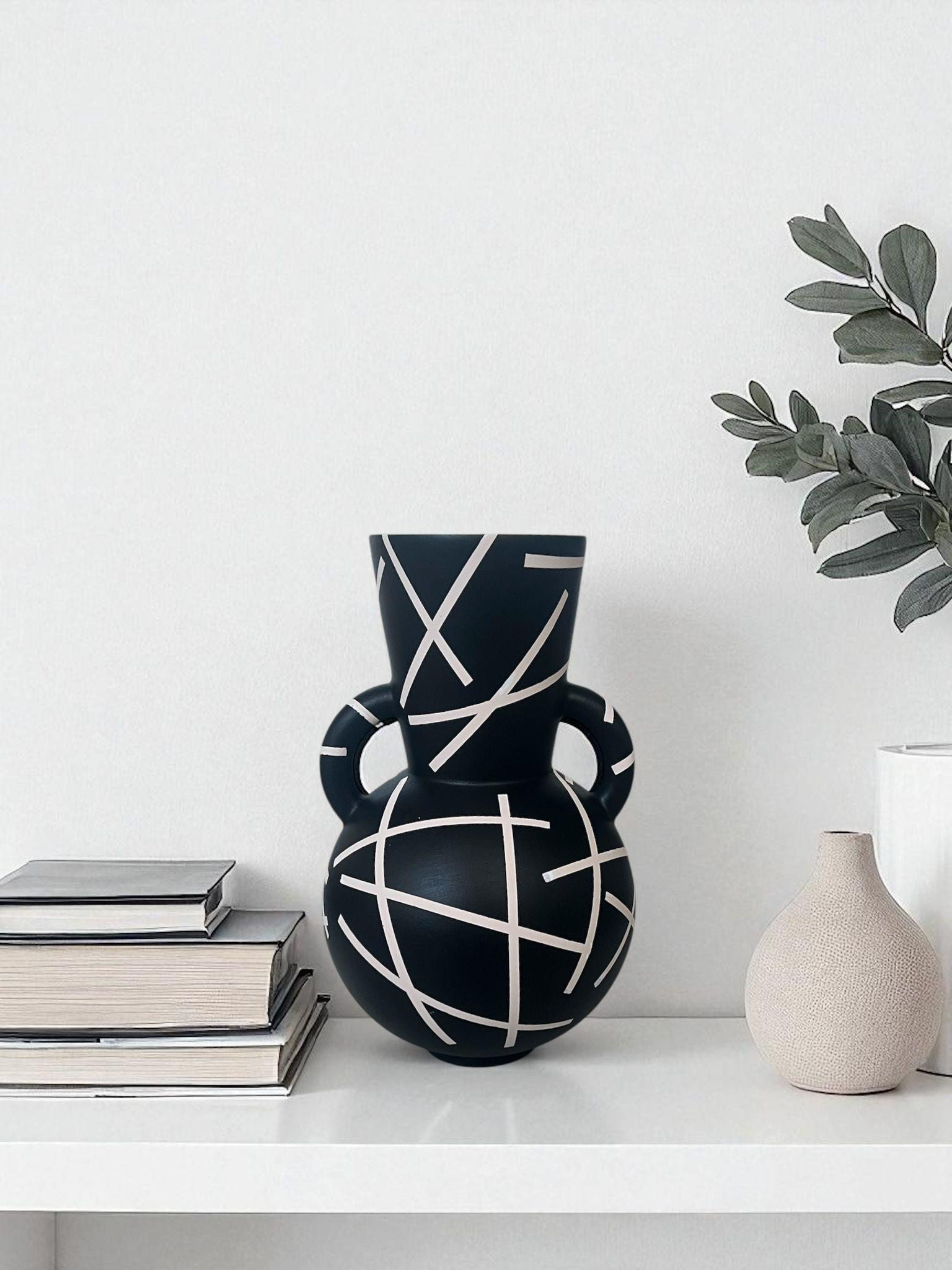 El yapımı detayları ve özgün tasarımıyla dikkat çeken Mossa Seramik Vazo, evinizde modern ve estetik bir atmosfer oluşturur. Siyah zemin üzerindeki beyaz çizgiler, sanatsal bir dokunuş kazandırırken dekorasyonunuzda farklı bir tarz yaratır. Çift kulplu formu sayesinde klasik ile modernin birleşimini yansıtır. Sehpa, konsol veya raf üzerinde tek başına dekoratif bir obje olarak kullanabileceğiniz gibi, içine yerleştireceğiniz kuru çiçekler ve dallarla da şık bir tamamlayıcı haline gelir.