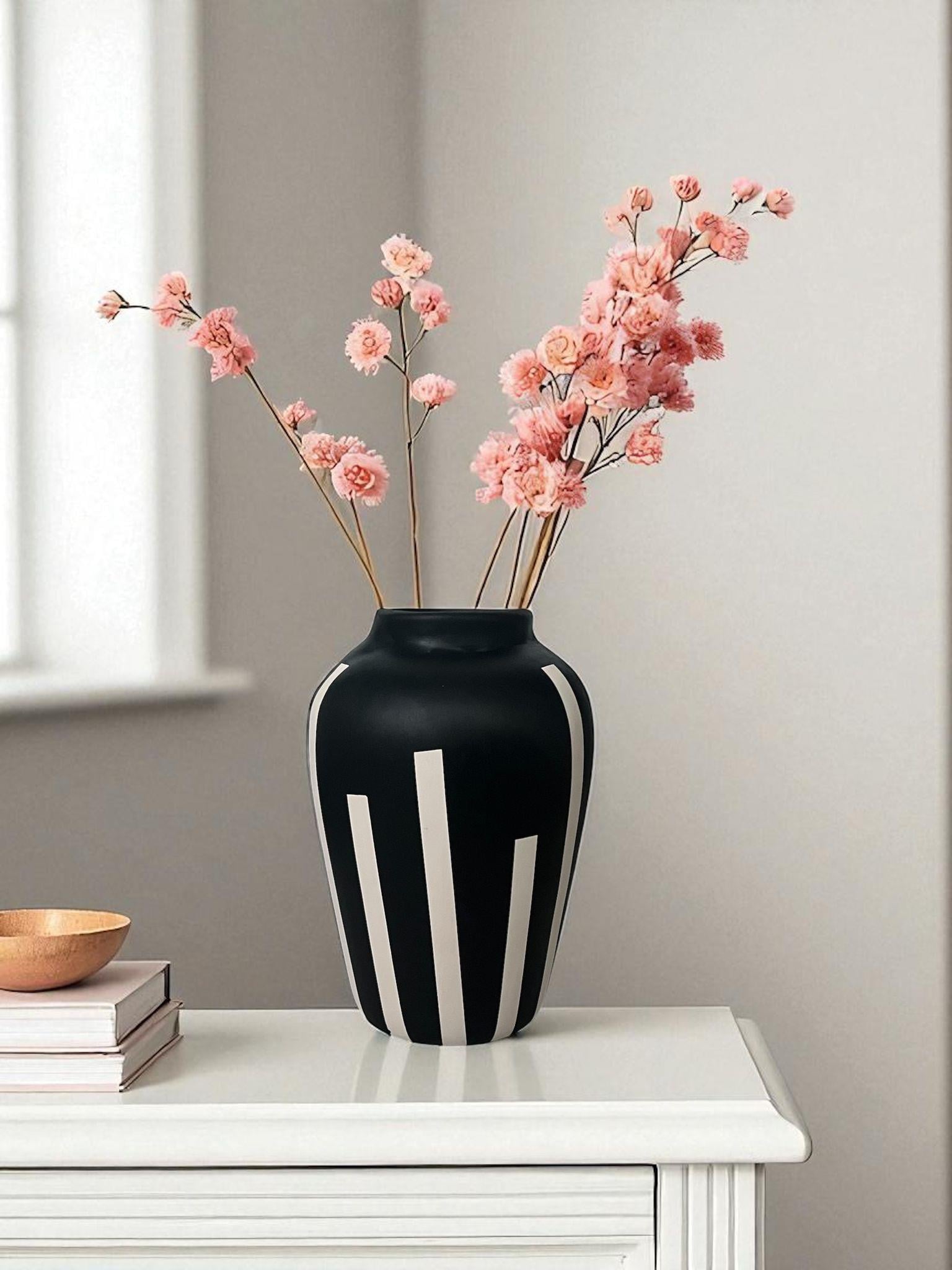 Minimalist ve zarif tasarımıyla öne çıkan Trio Seramik Vazo, evinizin her köşesinde modern bir dokunuş yaratır. Siyah üzerine beyaz çizgilerin uyumu, dekorasyonunuza güçlü bir kontrast ve estetik bir denge kazandırır. 28 cm boyu ve 17 cm genişliği sayesinde sehpa, konsol veya raf üzerinde tek başına şık bir obje olurken, içine yerleştireceğiniz kuru çiçekler veya yapay bitkilerle de tamamlayıcı bir görünüm sunar.